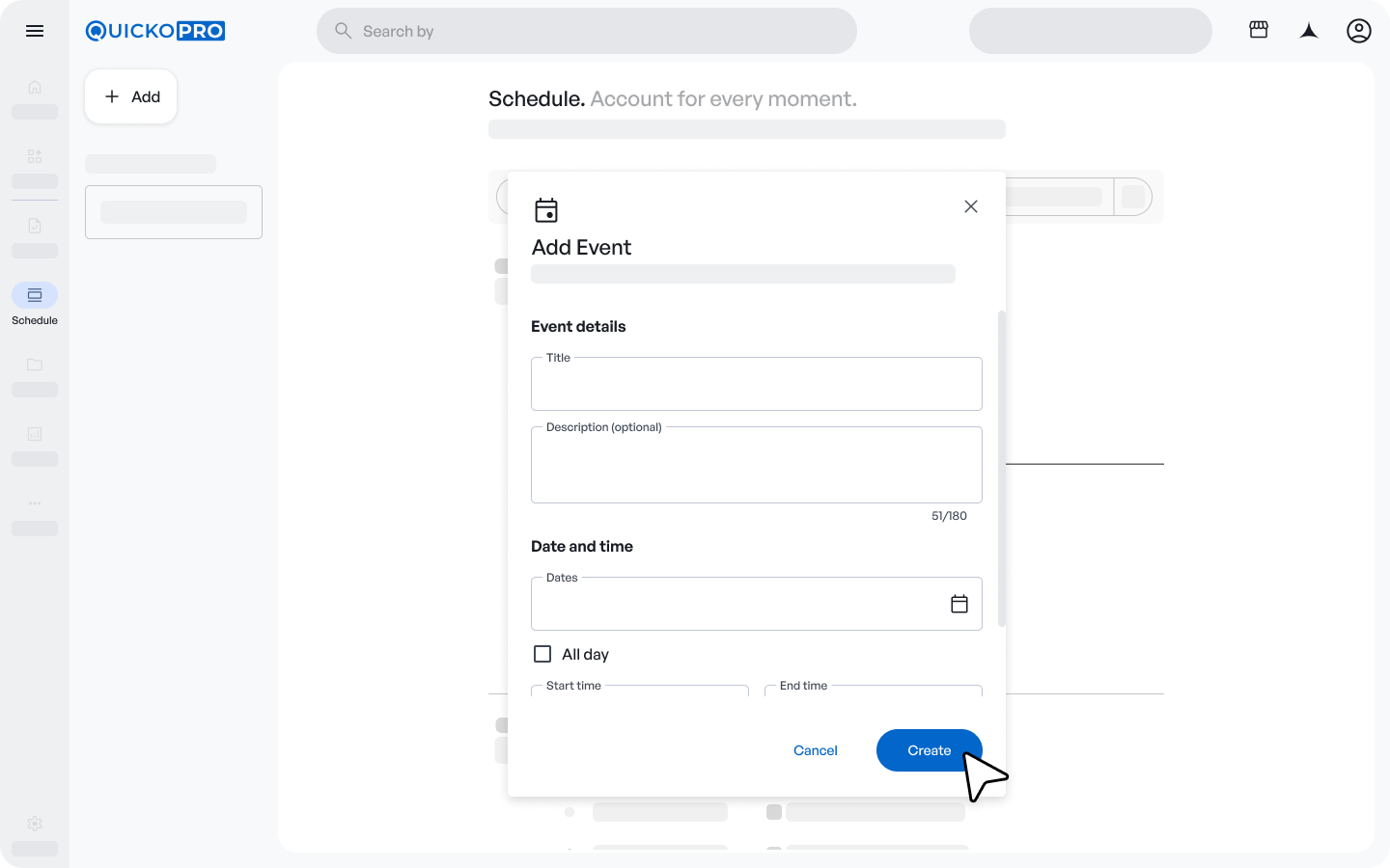Schedule shows all your events in one place — customer bookings, Out of Office blocks, and any other events from your connected calendars. Event types Calendar events: Meetings and calls you create directly in Schedule. Bookings: Events linked to an ...