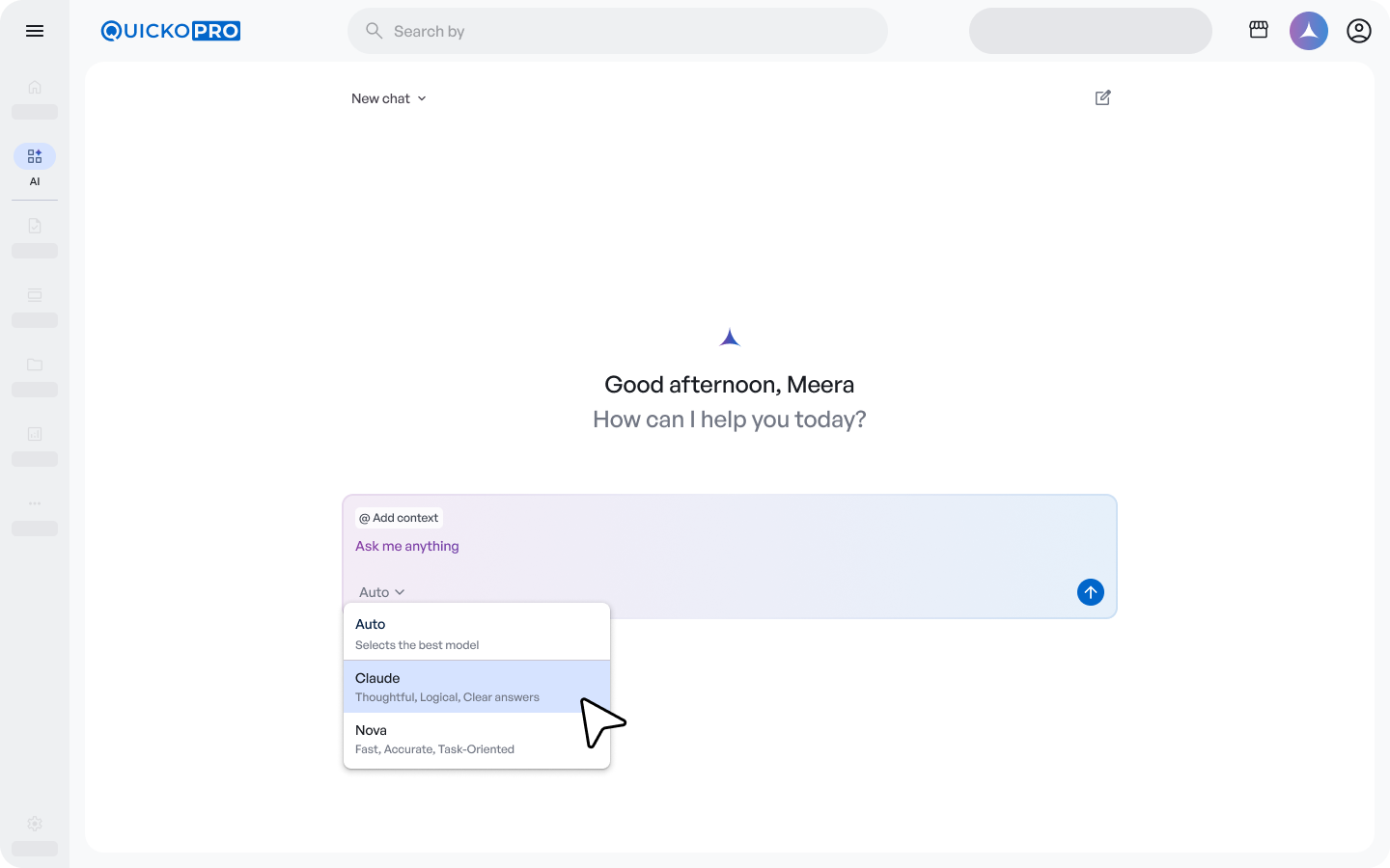 Choose which AI model generates your responses in Cue. While Cue can automatically pick the best model for your questions, you can switch models anytime if you have a specific preference or want a different style of answer.